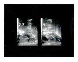| Ultrassonografia obstétrica de um feto com 16 semanas. O círculo branco à direita é a cabeça, voltada para a esquerda. É possível identificar a testa às 10h, a orelha esquerda às 7h e a mão direita cobrindo os olhos às 9h. | |