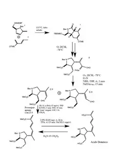 A síntese do ácido domóico foi descrita por Clayden et al. (2005) no artigo Chemistry of domoic acid, isodomoic acids, and their analogues (Química do ácido domóico, ácidos isodomóicos e seus análogos). Usando os intermediários 5 e 6, uma reação de Diels-Alder produziu um composto bicíclico (7). Em seguida, o 7 foi submetido à ozonólise para abrir o anel de seis membros, levando ao seleneto (8). O 8 foi então deselenado para formar o 9 (E-9 e Z-9), levando, por fim, à formação do (-) ácido domóico.[1]