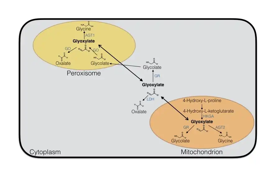 Glioxilato é produzido via duas rotas através da oxidação do glicolato nos peroxissomos ou através do catabolismo da hidroxiprolina nas mitocôndrias.[12] Nas peroxissomas, o glioxilato é convertido em glicina por AGT1 ou em oxalato por glicolato oxidase. Na mitocôndria, glioxilato é convertido em glicina por AGT2 ou em glicolato por glicolato redutase. Uma pequena quantidade de glioxilato é convertido em oxalato por lactato deidrogenase citoplásmica.[13]