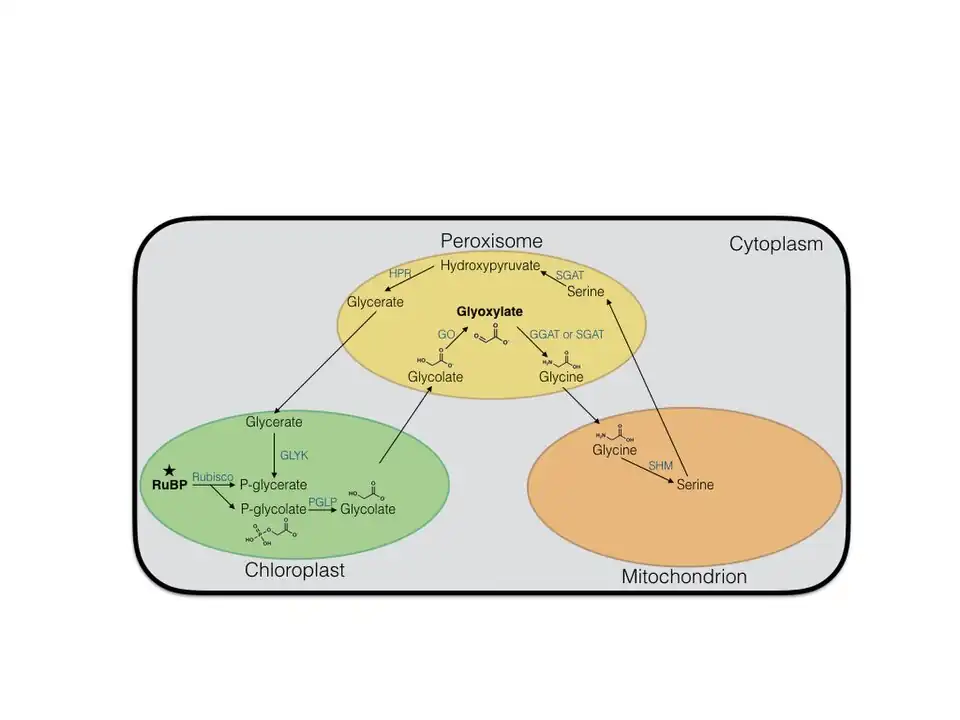 Além de ser um intermediário na via do glioxilato, o glioxilato também é um intermediário importante na rota da fotorrespiração. Fotorrespiração é um resultado da reação de Rubisco secundária com O2 ao invés de CO2. Embora tenha sido considerado um desperdício de energia e recursos, a fotorespiração mostrou ser um importante método de regeneração de carbono e CO2, removendo fosfoglicolato tóxico, e iniciando mecanismos de defesa.[14][15] Na fotorrespiração, glioxilato é convertido de glicolato através da atividade de glicolato oxidase no peroxissoma. É então convertido em glicina através de ações paralelas por SGAT e GGAT, que é então transportado para a mitocôndria.[16][15] Tem sido também relatado que o complexo piruvato deidrogenase pode desempenhar um papel no metabolismo de glicolato e glioxilato.[17]