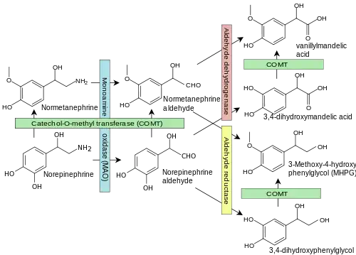 Noradrenalina é metabolizada em normetanefrina e VMA.[2][7][8][9] A norepinefrina é um dos hormônios produzidos pelas glândulas supra-renais, encontradas no topo dos rins. Esses hormônios são liberados no sangue durante períodos de estresse físico ou emocional, fatores que podem distorcer os resultados do teste.[10][11]
