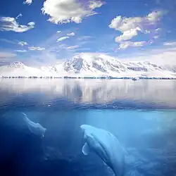 Os oceanos constituem uma grande massa de água líquida que ocupa 71% da superfície do planeta e possuem espessura média de 3,7 km. Embora sejam divididos em oceanos Pacífico, Atlântico, Índico e Ártico, são comumente referidos como um único oceano global, já que estão todos conectados entre si.[28] Os oceanos são divididos em duas camadas principais de acordo com a profundidade. A camada superficial, com apenas cem metros de espessura, é aquela onde a luz solar consegue penetrar exibindo, assim, um grande dinamismo. As águas profundas, por outro lado, permanecem em constante frio e escuridão com temperatura praticamente uniforme.[29]
