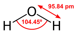 A água é uma substância química cujas moléculas são formadas por dois átomos de hidrogênio covalentemente ligados a um átomo de oxigênio, sendo sua fórmula química dada por H2O. A geometria de equilíbrio para uma molécula isolada possui dimensões de 0,0958 nanômetros nas ligações O-H, e um ângulo H-O-H de 104°27'.[4] Estas moléculas interagem entre si sobretudo através da formação de pontes ou ligações de hidrogênio (que ocorrem quando átomos de hidrogênio são atraídos por átomos de oxigênio, mais eletronegativamente carregados), o que faz com que as moléculas, no estado líquido, fiquem 15% mais próximas entre si do que se agissem somente sob forças de Van der Waals, embora estas ligações também restrinjam o número de moléculas vizinhas para tipicamente quatro. A eletrólise da água permite a quebra das ligações atômicas, separando o hidrogênio e o oxigênio com a passagem de uma corrente elétrica.[5]
