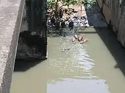 Um grupo de cinco capivaras adultas acompanhados de três filhotes retornam ao muito poluído córrego que atravessa a Universidade de São Paulo, de onde haviam emergido para se alimentarem de grama. O córrego recebe águas residuais não tratadas.