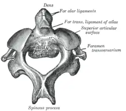 O áxis é a segunda vértebra cervical e é atípica por possuir um Processo odontóide ("dente"), que articula-se com o atlas. No mais, a maioria das características são comuns às das outras vértebras cervicais, como o forame transverso para a passagem da artéria vertebral. O Áxis tem este nome por servir de eixo para a rotação do atlas com o crânio que ele suporta.