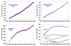 - ↑ "4.1.1 Sources of Greenhouse Gases" Arquivado em 4 de março de 2016, no Wayback Machine.. IPCC TAR WG1 2001. Página visitada em 13 de abril de 2014.