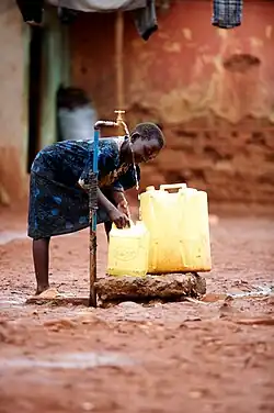 Uma menina coleta água limpa de um abastecimento de água comunitário em Kawempe, Uganda