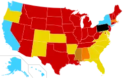 Este gráfico lista apenas as penalidades autorizadas especificamente pelas leis estaduais que explicitamente restringem (ou proíbem) abortos. O gráfico não aborda o risco de ser processado por violar qualquer outra lei devido ao aborto. A jurisprudência em torno dessa questão – se leis como "leis de personhood fetal"[176] ou leis originalmente destinadas a proteger mulheres grávidas e suas gestações de agressores externos podem agora também ser usadas para processar mulheres que obtêm abortos ou que terminam suas próprias gestações, deliberadamente ou não[177] – é instável, variável e, em alguns estados, pouco clara.[178] Estados com penalidades criminais bloqueadas por um tribunal, que ainda não entraram em vigor ou não são aplicadas são denotados por um fundo cinza.
