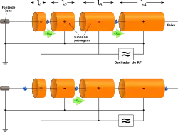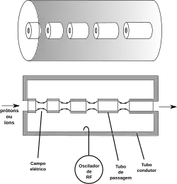 A diferença entre os dois surge do fato de os elétrons atingirem uma velocidade próxima à da luz muito rapidamente, enquanto os prótons e íons, por serem mais massivos, tem sua velocidade incrementada lentamente. Na figura 2 encontra-se um esquema de uma estrutura aceleradora de onda estacionária usada para prótons e íons. É composta por um tubo condutor contendo eletrodos cilíndricos de comprimentos diferentes dispostos horizontalmente, formando um conjunto de cavidades ressonantes acopladas.