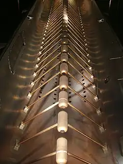 Os diferentes comprimentos dos tubos refletem o fato das partículas pesadas terem sua velocidade aumentada lentamente. Na figura 3 é apresentado uma foto de uma estrutura deste tipo.