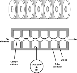 Na figura 4, é apresentado um esquema de uma estrutura aceleradora de onda caminhante usada para elétrons, trata-se de um tubo condutor (guia de ondas) contendo uma série de discos paralelos com um furo central. Elétrons também podem usar estruturas aceleradoras de onda estacionária, compostas por uma série de cavidades ressonantes, como aquela apresentada na figura 5.