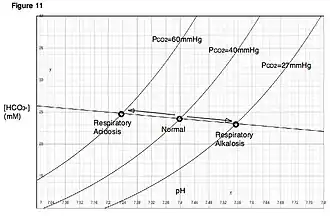 - Na alcalose respiratória aguda, níveis elevados de dióxido de carbono são "expirados" pelos pulmões, que estão hiperventilando.