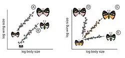 A inclinação refere-se a diferenças em como o tamanho relativo da asa muda com o tamanho do corpo entre as espécies.