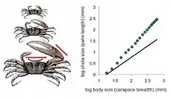 Ele queria entender como o caranguejo crescia para produzir uma quela exageradamente grande, mais especificamente, o tamanho do corpo em relação ao tamanho da quela em diferentes estágios de desenvolvimento. O resultado obtido foi uma relação linear na escala logarítmica. A inclinação dessa relação foi maior que 1 (1,57) . Dessa forma é possível inferir que: para qualquer unidade de aumento no tamanho do corpo no tempo, havia um aumento proporcionalmente maior no tamanho da quela, ou seja, o tamanho exagerado da quela era porque ela crescia em uma taxa mais rápida do que o resto do corpo.