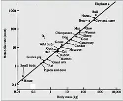 Após estudos de Max Kleiber, o qual mediu a taxa metabólica basal em um grupo de mamíferos com massa entre 0,15 kg até 679 kg. Traçando um gráfico da taxa metabólica (kcal/dia) em função da massa (kg) , notou-se que os pontos definiram uma reta com inclinação 0,74. A regressão linear forneceu a seguinte equação alométrica . Esse resultado se mostrava contrario com a Lei de superfície de Rubner.[5]