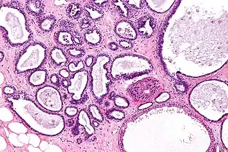 | Micrograph showing fibrocystic breast changes. H&E stain. | |