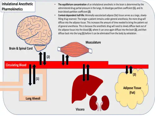 Os anestésicos inalados são eliminados por meio da expiração, após a difusão nos pulmões. Esse processo depende em grande parte do coeficiente de partição anestésico sangue:gás, da solubilidade do tecido, do fluxo sanguíneo para os pulmões e da frequência respiratória e do volume inspiratório do paciente.[4] Para gases que têm solubilidade mínima no tecido, o término da anestesia geralmente ocorre tão rapidamente quanto o início da anestesia. No entanto, para gases com alta solubilidade tecidual, o término da anestesia geralmente depende do contexto. Assim como ocorre com as infusões intravenosas de anestésicos, a administração prolongada de gases anestésicos altamente solúveis geralmente resulta em meias-vidas mais longas da droga, eliminação mais lenta do cérebro e da medula espinhal e atraso no término da anestesia.[3]