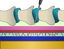 Uma epidural é injetada no espaço epidural, dentro do canal espinhal ósseo, mas fora da dura-máter. Em contato com a superfície interna da dura-máter está outra membrana chamada aracnoide, que contém o líquido cefalorraquidiano. Em adultos, a medula espinhal termina em torno do nível do disco entre L1 e L2, enquanto em neonatos ela se estende até L3, mas pode chegar até L4.[16] Abaixo da medula espinhal existe um feixe de nervos conhecido como cauda equina ou "cauda de cavalo". Consequentemente, as injeções peridurais lombares apresentam baixo risco de ferir a medula espinhal. A inserção de uma agulha epidural envolve a passagem de uma agulha entre os ossos, através dos ligamentos e no espaço epidural, sem perfurar a camada imediatamente abaixo contendo líquor sob pressão.[16]