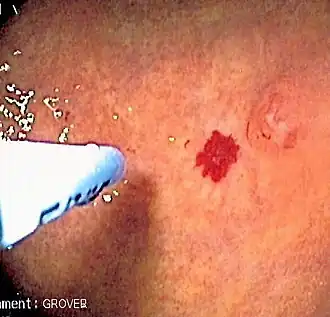 | Endoscopia de uma angiodisplasia do cólon coagulada com um jato de argônio ionizado. | |