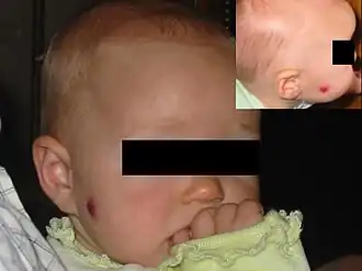 | Hemangioma no rosto de um bebê. | |