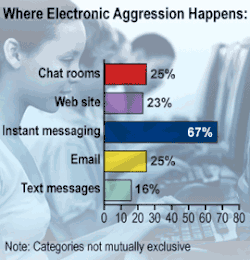 No ensino médio, as meninas são mais propensas a se envolver nesse tipo de assédio do que os meninos.[7] Mas, independente do gênero do assediador, seu objetivo é intencionalmente envergonhar, perseguir ou fazer ameaças on-line a outros. Esse assédio moral pode ocorrer por meio de e-mail, mensagens de texto e mensagens para blogs e sites (como os de relacionamento).