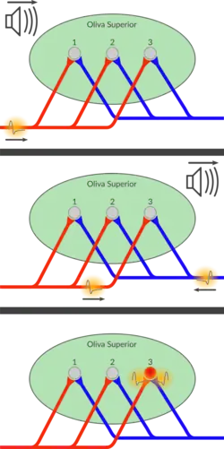 Os núcleos olivares superiores do tronco cerebral apresentam grande participação na detecção do som. O núcleo olivar superior pode ser dividido em duas partes: o núcleo olivar superior medial e o núcleo olivar superior lateral. O núcleo lateral é responsável pela detecção da direção de emissão sonora, presumidamente por comparação da diferença de intensidade sonora recém chegada ao ouvido e pela emissão de sinal apropriado do córtex auditivo, para estimar a direção.[18] Alternativamente, o núcleo medial tem mecanismos específicos para detectar o intervalo de tempo entre sinais acústicos que entram nos dois ouvidos.[19] A maioria dos neurônios do núcleo medial apresentam dois dendritos principais, um se projetando para a direita e outro para a esquerda. O sinal acústico do ouvido direito invade o dendrito direito e o sinal acústico do ouvido esquerdo invade o sinal do dendrito esquerdo. A intensidade de excitação dos neurônios são altamente sensíveis ao intervalo de tempo específico entre os dois sinais acústicos percebidos no ouvido. Os neurônios mais próximos ao perímetro do núcleo respondem em sua plenitude a um intervalo curto de tempo, enquanto os próximos da borda oposta respondem a intervalos longos e os intermediários, a intervalos intermediários. Assim, um padrão espacial de estimulação neuronal no núcleo olivar superior medial pode ser desenvolvido, o que será enviado ao córtex cerebral auditivo, onde a direção do som é determinada pelo local dos neurônios estimulados maximamente.[20]