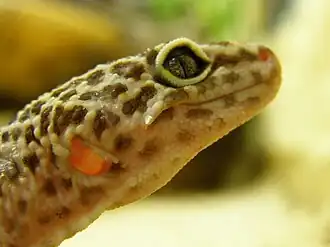 Nos répteis, vibrações no tímpano são transmitidas ao fluido do ouvido interno pela extracolumela e pelo estribo. O receptor primário é a papila auditiva, auxiliada por receptores auditivos complementares.[36] Diferente dos demais répteis, as cobras não possuem tímpano, mas elas apresentam extrema sensibilidade à vibrações na cabeça. Com uma frequência ótima, uma amplitude de apenas 0,1 nm pode ser percebida por esses animais.[37]