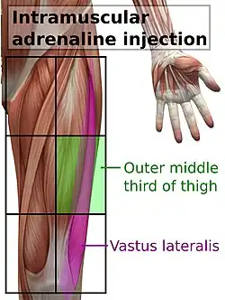 Quando há suspeita de um quadro de anafilaxia, a solução de epinefrina deve ser administrada o mais rápido possível mediante uma injeção intramuscular, no meio da face externa da coxa, que corresponde à localização do músculo vasto lateral.[3] Pode ser necessário repetir a injeção a cada 5 a 15 minutos se não houver uma melhoria suficiente do doente.[4] Estima-se que uma segunda dose seja necessária em aproximadamente 16–35% dos episódios, sendo raramente necessárias mais de duas doses; em cerca de 80% dos casos em que a segunda dose é administrada, é-lo feito por um profissional de saúde.[4] Não se conhece quais são os doentes mais suscetíveis à necessidade de múltiplas injeções.[4] A via intramuscular é preferida à administração subcutânea porque esta pode ter uma absorção mais lenta.[4][5] Os efeitos adversos ligeiros da epinefrina incluem tremores, ansiedade, dores de cabeça e palpitações.[4]