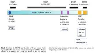 O gene BRCA1 codifica uma proteína de 1863 aminoácidos denominada BRCA1. Essa proteína contém na sua região amino (N) terminal um domínio RING (RING finger domain) rico em cisteínas, que constitui um domínio zinco (zinc-binding domain) encontrado em uma variedade de proteínas regulatórias; e em sua região carboxi (C) terminal um domínio BRCT em tandem, que constitui um domínio fosfopeptídeo de reconhecimento que se liga a peptídeos contendo um padrão fosfo-SXXF (S para Serina, F para Fenilalanina e X para variável). Há também o domínio chamado Coiled Coil em BRCA1, por meio do qual este interage com BRCA2 por intermédio da proteínas PALB2 (partner and localizer of BRCA2) durante o reparo por recombinação homólogo.[12]