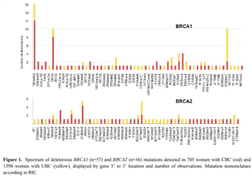 Uma pesquisa realizada em 2010 a respeito das mutações nos genes BRCA 1 e 2 em 2103 mulheres jovens com câncer de mama unilateral e contralateral, identificou 113 mutações deletérias diferentes, das quais 57 ocorrem em BRCA1 (figura 1).[14][10]