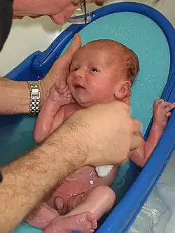Um bebê tomando banho.