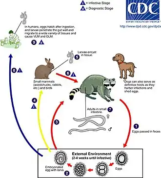 . PMID 16223954. doi:10.1128/CMR.18.4.703-718.2005. Consultado em 15 de janeiro de 2022 - 1 2 Sircar, Anita D. (2016). «Raccoon Roundworm Infection Associated with Central Nervous System Disease and Ocular Disease — Six States, 2013–2015». MMWR. Morbidity and Mortality Weekly Report (em inglês). ISSN 0149-2195. doi:10.15585/mmwr.mm6535a2. Consultado em 15 de janeiro de 2022