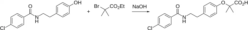 A p-clorobenzamida da tiramina sofre uma síntese etérica de Williamson com 2-bromo-2-metilpropionato de etila para completar a síntese. O grupo éster é hidrolisado em meio reacional alcalino.