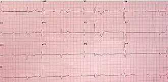 ECG de um bloqueio atrioventricular completo. A onda P e a onda QRS aparecem sem a sincronia normal.