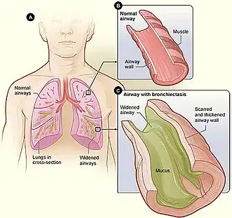 A bronquiectasia é uma doença em que há aumento permanente de partes das vias aéreas do pulmão.[3] Sintomas normalmente incluem uma tosse crônica com produção de muco.[2] Outros sintomas incluem falta de ar, tosse com sangue, e dor no peito.[1] Sibilos e hipocratismo digital também podem ocorrer.[1] As pessoas com a doença muitas vezes desenvolvem infecções pulmonares com frequência.[6]