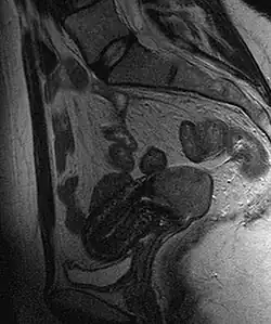 Câncer do colo do útero visto em imagem de ressonância magnética da pelve em T2, posição sagital.
