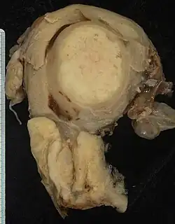 Este grande carcinoma escamoso (na parte inferior da imagem) obliterou o colo e invadiu o segmento inferior do útero. O útero também apresenta um leiomioma arredondado em sua parte superior.