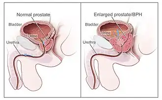 A próstata é um órgão do sistema reprodutor masculino que ajuda a produzir e armazenar o fluido seminal. Em homens adultos, a próstata normal mede cerca de 3 centímetros de comprimento e pesa em torno de vinte gramas.[7] Ela está localizada na pelve, abaixo da bexiga urinária e na frente do reto. A próstata envolve parte da uretra, o duto que carrega a urina da bexiga durante a micção e carrega o sêmen durante a ejaculação.[8] Devido a sua localização, as doenças da próstata geralmente afetam o controle urinário, a ejaculação e raramente a defecação. A próstata contém pequenas glândulas que produzem cerca de vinte por cento do fluido que constitui o sêmen.[9] No câncer de próstata, estas células sofrem mutações e se transformam em células cancerosas. As glândulas da próstata necessitam de hormônios masculinos, conhecidos como andrógenos, para funcionar corretamente. Os andrógenos incluem a testosterona, que é produzida nos testículos, a desidroepiandrosterona, produzida nas supra-renais e a Di-hidrotestosterona, que é convertida a partir da testosterona no interior da próstata. Os andrógenos também são responsáveis pelas características sexuais secundárias dos homens, como os pêlos da face e aumento da massa muscular.