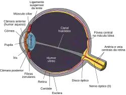 - Retinoblastoma: Originado das células imaturas (blastoma) que dão origem às células da retina. Cerca de 40% são causados por defeito no gene RB1 e afetam ambos olhos, surgem em menores de três anos. Os outros 60% afetam apenas um olho e surgem em crianças menores de cinco anos. Causa estrabismo, "pupila branca capaz de refletir a luz como o olho de um gato" (leucocoria) e inflamação na retina. Pode ser tratado com terapia local (com frio, calor ou laser) caso o tumor seja pequeno e localizado ou com cirurgia, radioterapia e quimioterapia com tumor difuso. A sobrevivência é de 90% em 5 anos.[5]