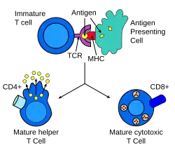 O antígeno apresentado pelo MHC é reconhecido pelos receptores dos linfócitos T (TCR). Com o reconhecimento do antígeno pelo linfócito T virgens, os linfócitos T são ativados e passam a liberar interleucinas que promovem a diferenciação dos Linfócito T e expansão clonal.[2]