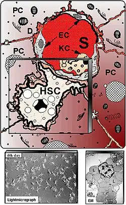 - ↑ Tsuchida, Takuma; Friedman, Scott L. (2017). «Mechanisms of hepatic stellate cell activation». Nature Reviews Gastroenterology & Hepatology (em inglês). 14 (7): 397–411. ISSN 1759-5053. doi:10.1038/nrgastro.2017.38