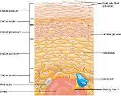 Ao contrário do melanócito e da célula de Langerhans,esta não é uma célula dendrítica, possuindo tonofilamentos de ceratina e desmossomos ocasionais que a ligam às células adjacentes. Estas células apresentam uma função sensorial. Através das células de Merkel e das terminações nervosas livres presentes na epiderme e também de vários tipos de terminações nervosas sensitivas presentes na derme, a pele recebe informações do meio ambiente e as envia para o sistema nervoso central.