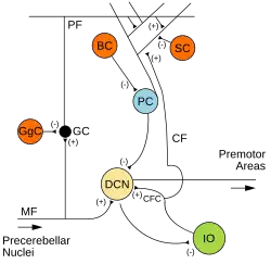 - ↑ Schonewille M, Khosrovani S, Winkelman BH, Hoebeek FE, DeJeu MT, Larsen IM, et al. (2006). «Purkinje cells in awake behaving animals operate at the up state membrane potential.». Nature Neuroscience. 9 (4): 459–461. PMID 16568098. doi:10.1038/nn0406-459