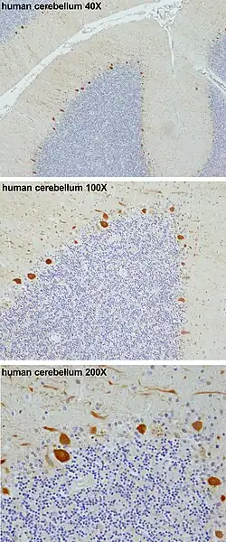 A camada de Purkinje do cerebelo, que contém os corpos celulares das células de Purkinje e da glia de Bergmann, expressando um grande número de genes únicos.[5] Marcadores de genes específicos de Purkinje foram propostos comparando o transcriptoma de camundongos deficientes de Purkinje com o de camundongos do tipo selvagem.[6] Um exemplo é a proteína 4 da célula de Purkinje (PCP4), que removida em camundongos knockout leva a dificuldades motoras e plasticidade sináptica alterada.[7][8] A PCP4 acelera tanto a associação quanto a dissociação do cálcio (Ca 2+ ) com a calmodulina (CaM) no citoplasma das células de Purkinje, e sua ausência prejudica a fisiologia desses neurônios.[7][8][9][10]