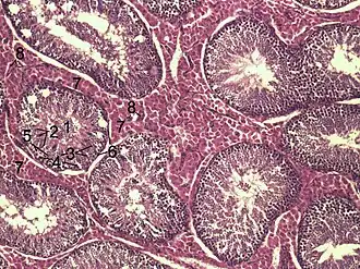 ![]() Secção histológica do parênquima testicular de um javali. 1 Lumen of Tubulus seminiferus contortus 2 espermátide 3 espermatócitos 4 espermatogônia 5 célula de Sertoli 6 Célula Mioide 7 Célula de Leydig 8 capilares | |