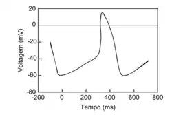 A fase de despolarização. Essa fase começa quando o potencial de membrana atinge -40 mV, o limiar para as células marca-passo. Quando o limiar é atingido, ocorre a abertura dos canais de cálcio voltagem-dependentes, causando o influxo de íons Ca2+. Esse influxo de cátions resulta em um aumento rápido do potencial de membrana de -40 mV para +10 mV.