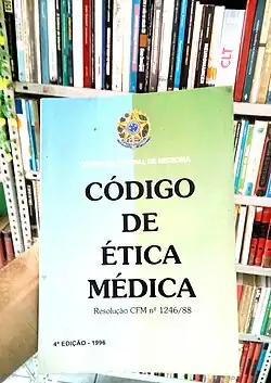 ![]() Edição do Código, publicada pelo CFM, em uma biblioteca municipal. | |