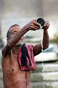 | Pessoa com desidratação grave causada por cólera, que leva a que os olhos se afundem nas órbitas e ao enrugamento da pele das mãos e dos pés | |