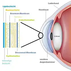 A Membrana de Descemet é facilmente regenerada, devido a sua formação a partir do Endotélio, ela reveste toda a superfície do Estroma que é composta por uma camada anterior perto ao Estroma e uma camada posterior perto ao Endotélio.