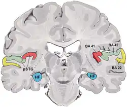 Córtex auditivo é a parte do cérebro que processa informações auditivas. É a parte do sistema auditivo que interpreta o tempo, harmonia, intensidade e frequência dos estímulos recebidos pelos ouvidos.[1] Nos humanos se localiza bilateralmente nos lados superiores do lobo temporal, dentro do sulco lateral e compreendendo partes dos giros transversais temporais e do giro temporal superior, incluindo o planum polare e o planum temporale (área de Brodmann: 22, 41 e 42).[2]